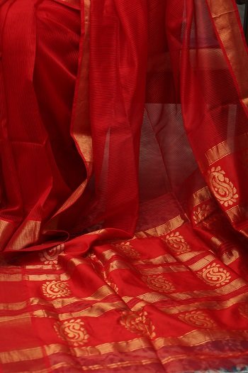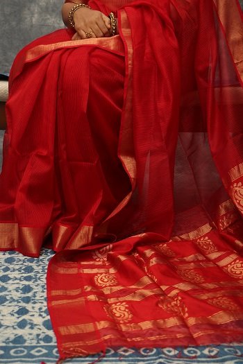 This beautiful bright red sari is a pure maheshwari silk handloom sari with zari weaving boarder, hansa butta and tassels at the end of the pallu.